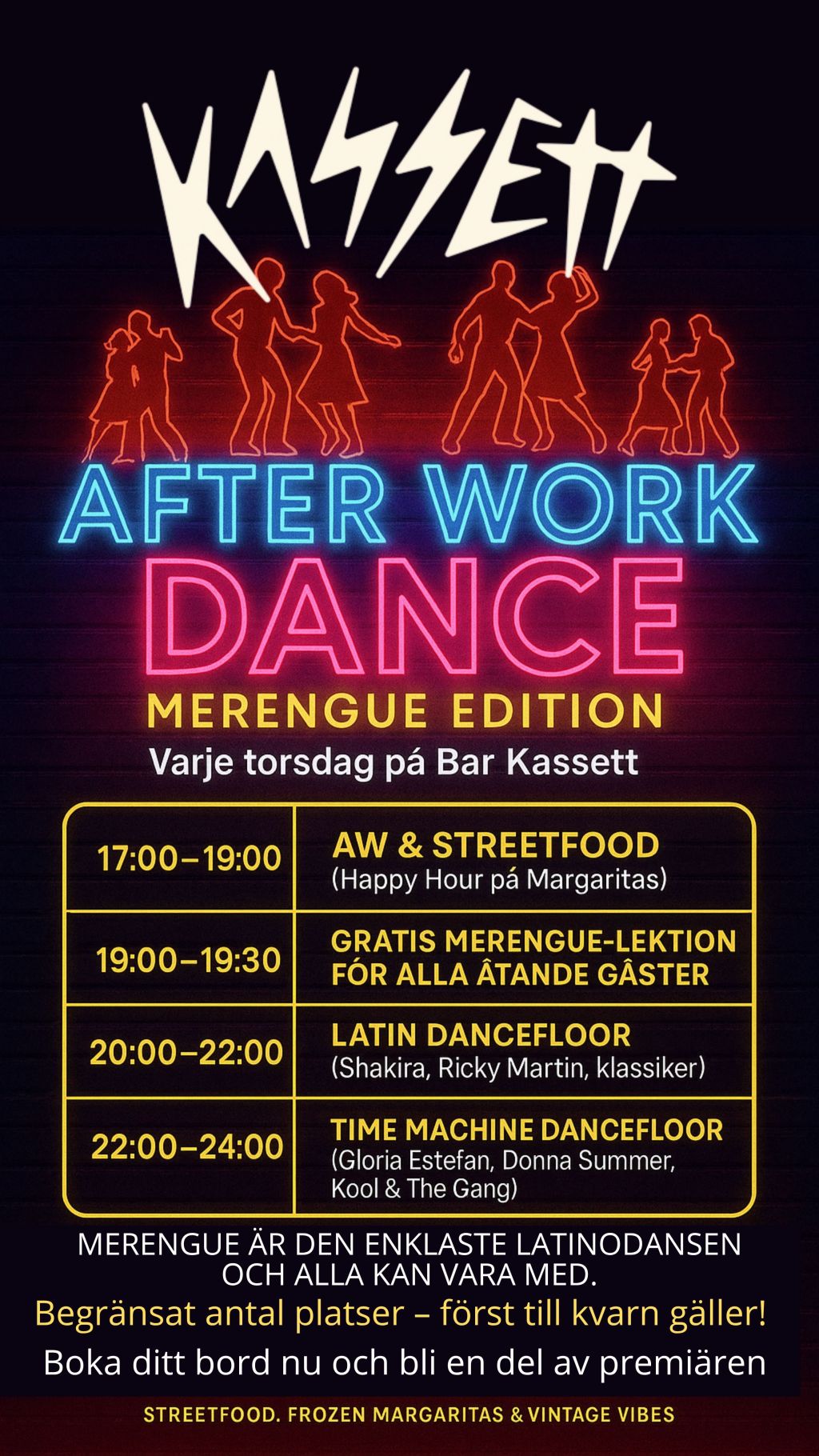 AFTER WORK DANCE Varje torsdag på Bar KassettTorsdagar betyder rytm, värme och streetfood med puls.Hos oss får du mat, dryck, instruktör och dansgolv, allt i ett paket.Merengue EditionInstruktör 19:00–19:30 visar grunderna, enkelt, avslappnat och roligt.Efteråt öppnar vi dansgolvet för social dans hela kvällen.Varje torsdag17:00–19:00 After Work & mat19:00–19:30 Dansinstruktör: merengue20:00–22:00 Social Dance & Time MachinePerfekt…